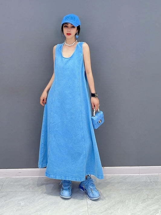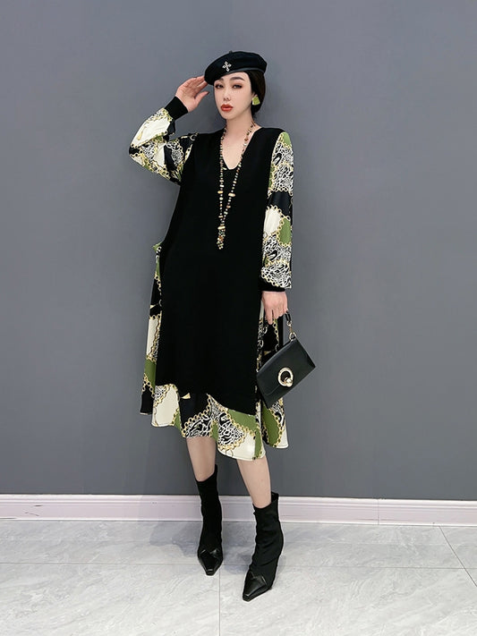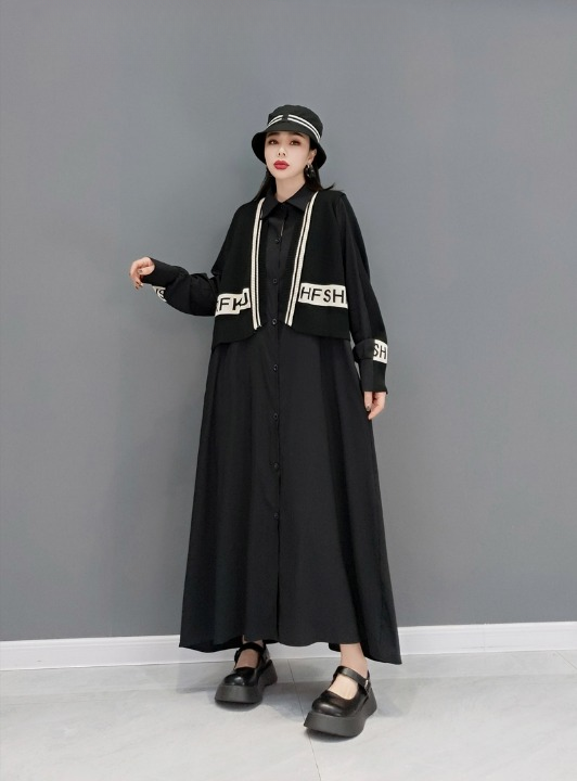 レイヤード風 シャツワンピース マキシ丈 ドッキングベスト
