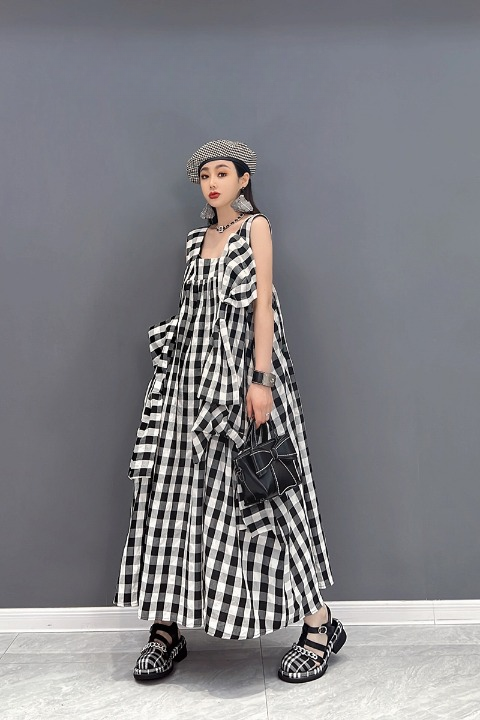 ギンガムチェック ノースリーブ ワンピース リボン付き