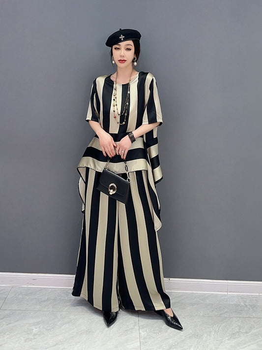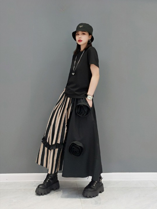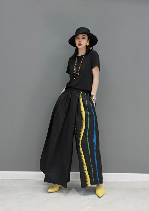 ワイドパンツ アシンメトリー柄 ウエストゴム 曲線ストライプ