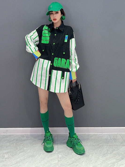 ストライプ スプライシング シャツワンピース ラウンドヘム