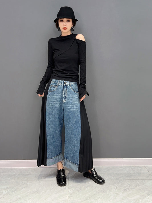 サイドプリーツ デニム ワイドパンツ スプライシング