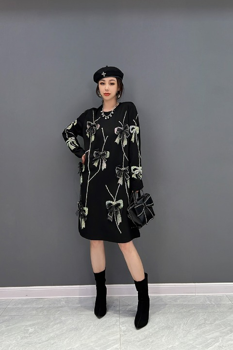 リボンモチーフ レース ニットワンピース ラウンドネック